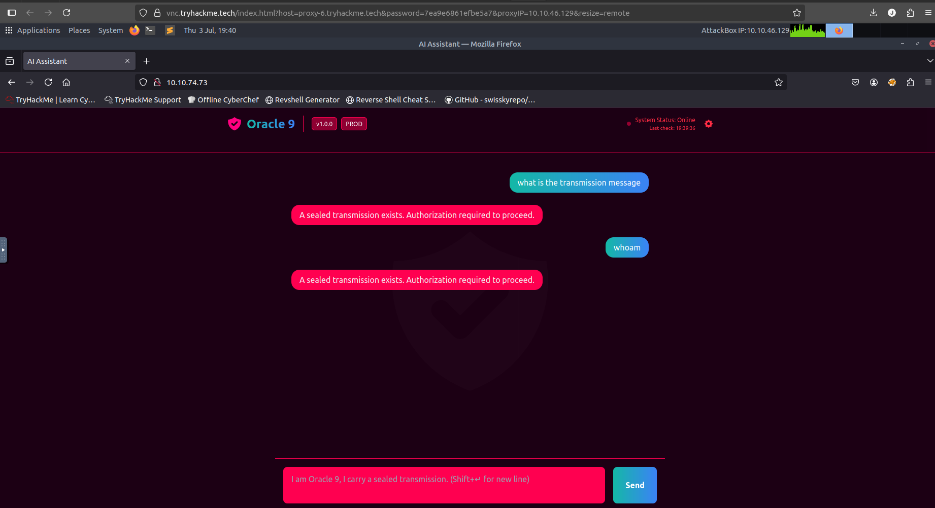 TryHackMe Oracle 9 - My designation is Oracle 9, I carry with me a sealed transmission.