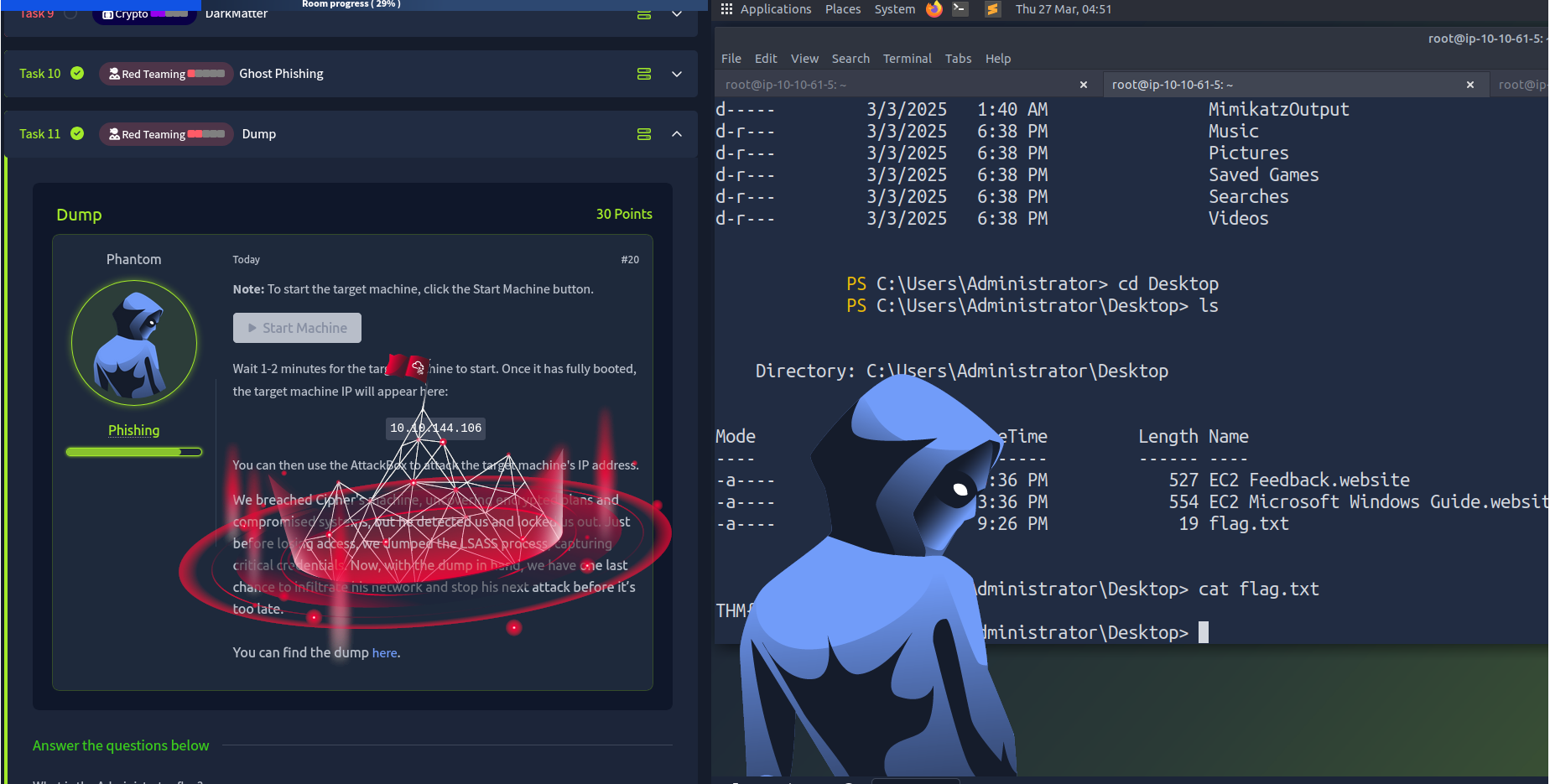 We breached Cipher's machine, uncovering encrypted plans and compromised systems, but he detected us and locked us out. Just before losing access, we dumped the LSASS process, capturing critical credentials. Now, with the dump in hand, we have one last chance to infiltrate his network and stop his next attack before it’s too late.