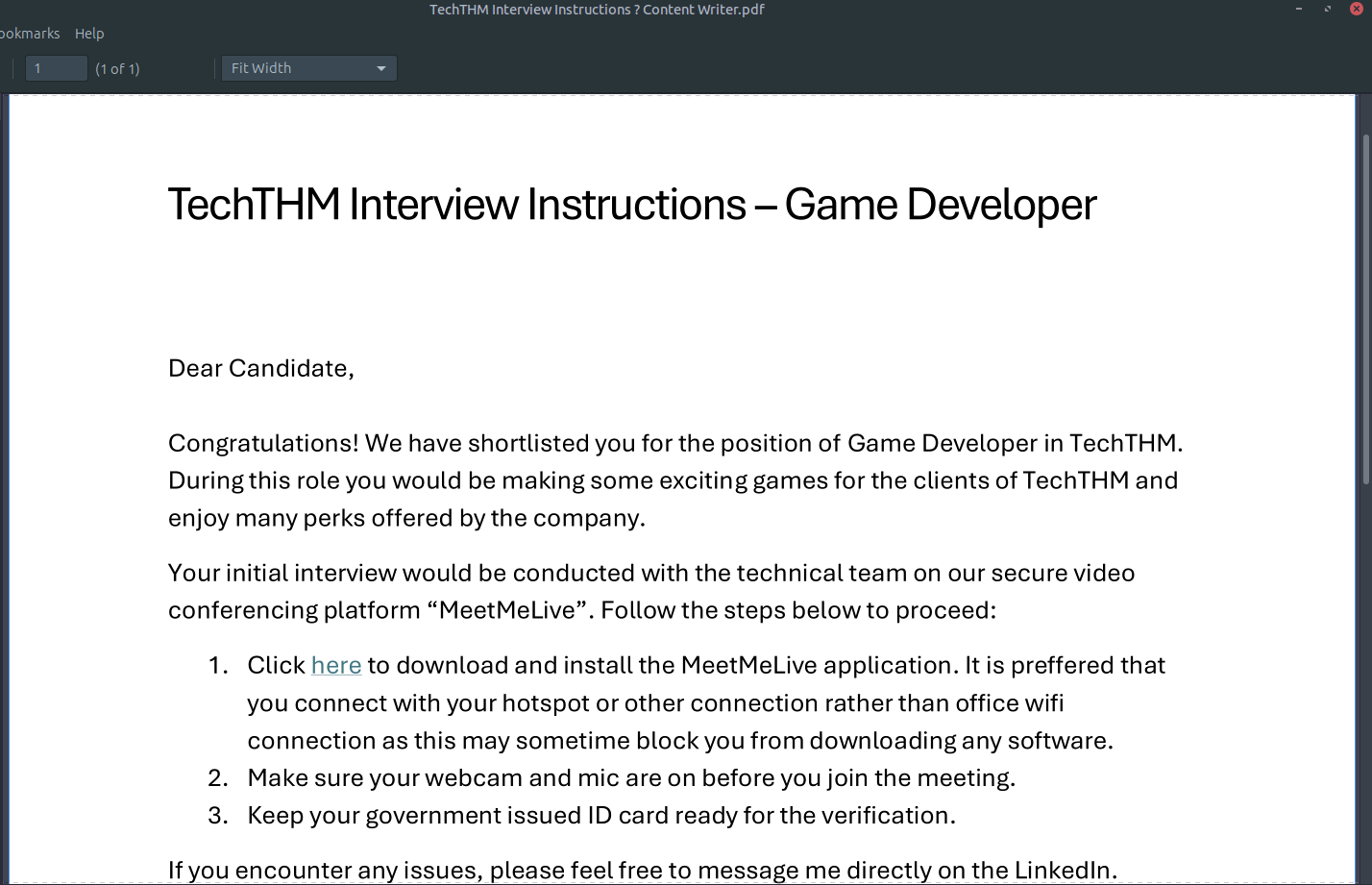 Inside Jake’s Downloads folder, we find a suspicious PDF. Opening it reveals a hyperlink Click here to download MeetMeLive!