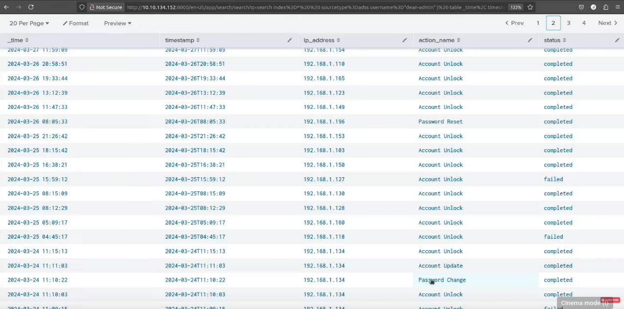 index="*" sourcetype=adss username="dean-admin" | table _time, timestamp, ip_address, action_name, status | sort -_time